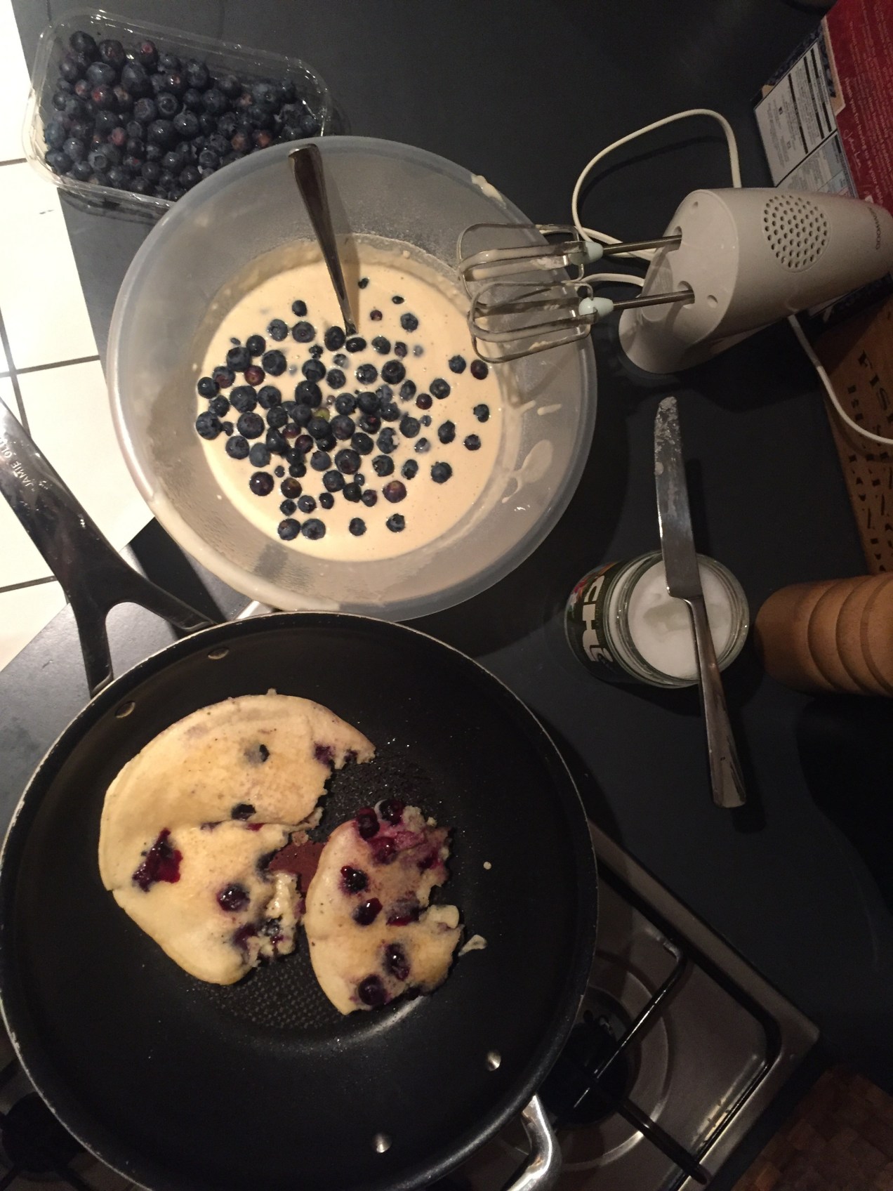 Blueberry Pancakes on a Monday night with Anita; my best work the ‘flip ‘n’ fail’.