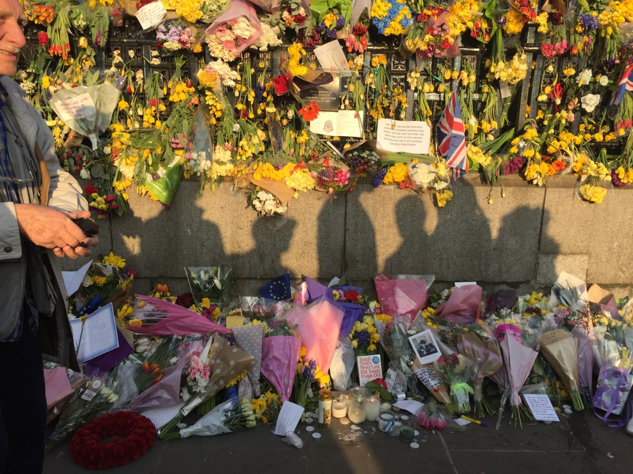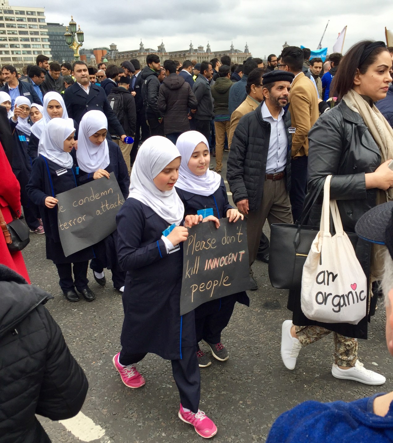 A week on from an incident which lasted 82 seconds, thousands of people gathered to link hands on Westminster Bridge in a show of solidarity. As rain began to fall, I walked past New Scotland Yard at 14:40 as a minute’s silence was being observed outside by police officers; exactly one week from the moment this all began. Just metres away on Westminster Bridge, closed to traffic for a few hours, members of the Ahmadiyya Muslim Youth Association wearing bright blue T-shirts with “I am a Muslim, ask me anything” stood out amongst the sea of people and these Muslim schoolgirls also passed by.